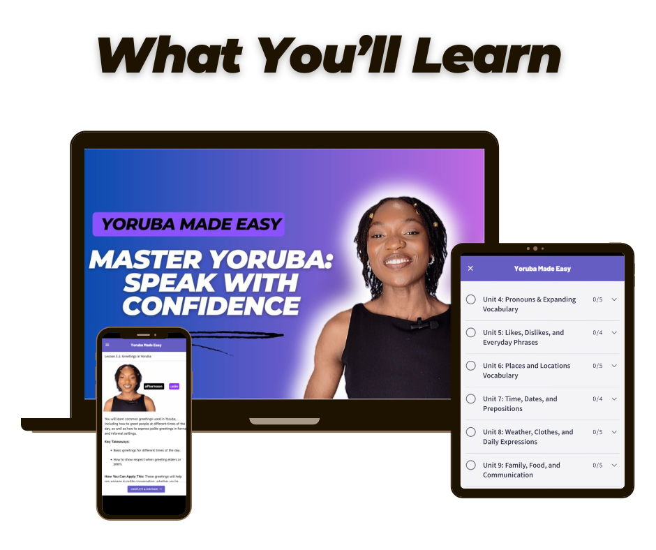 Learn self-introduction, greetings, the Yoruba alphabet, tones, numbers, days, months, and key grammar like pronouns, questions, and tenses.